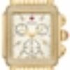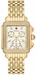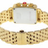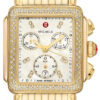Michele Deco 18k Gold Diamond Women’s Watch MWW06A000777. This 33mm x 35mm watch features an 18k yellow gold plated case and bracelet with a diamond-set bezel. The white Mother of Pearl dial has diamond hour markers, a chronograph feature and a date window displayed at 6 o’clock. It is powered by a battery-operated quartz movement.
