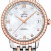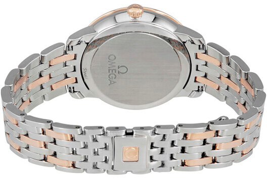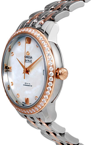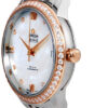 This Omega De Ville Prestige 424.25.33.20.55.002 timepiece combines luxurious style with classic design features, creating a beautiful and timeless look. The white mother of pearl dial is intricately detailed with diamond and roman hour markers, date window, and 18k rose gold bezel set with diamonds for a truly sophisticated finish. This 32.7mm stainless steel case is further highlighted by its two-tone bracelet and sliding clasp, making it comfortable and secure to wear all day long. Powering this elegant timepiece is an automatic chronometer-certified movement that provides reliable accuracy and a 48 hour power reserve.